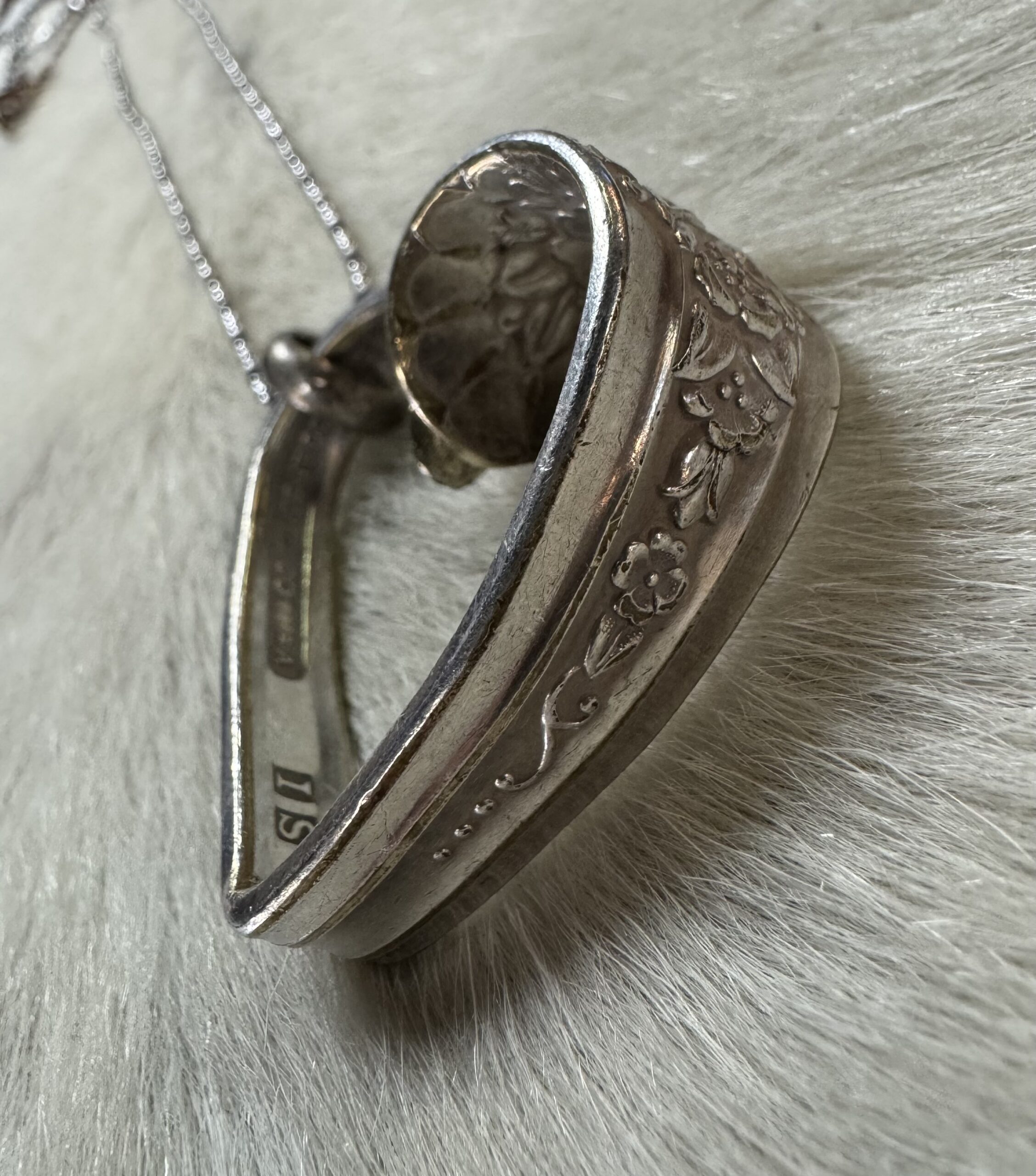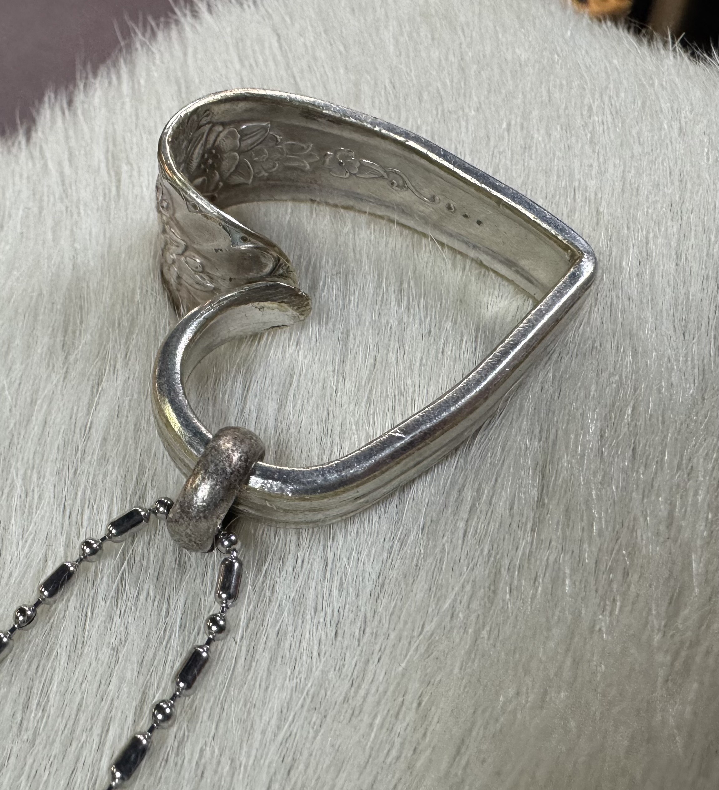 Heart made from silverware on 30″ chain.